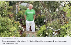 In 2024, Macmillan Cancer Support and the National Garden Scheme celebrated a 40 year partnership. Macmillan published an article that appeared in Sussex Express on 18th September. Click image to view. The NGS posted a great piece about my involvement with both online in May 2024 which you can read here. |