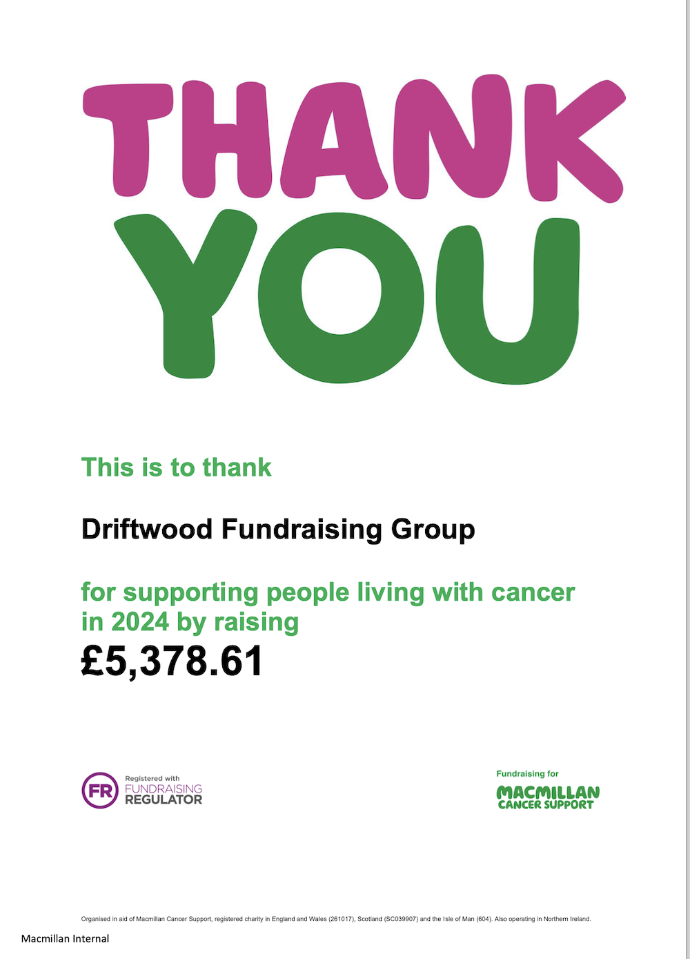 Below left is a copy of the receipt from Macmillan of monies raised in 2024.