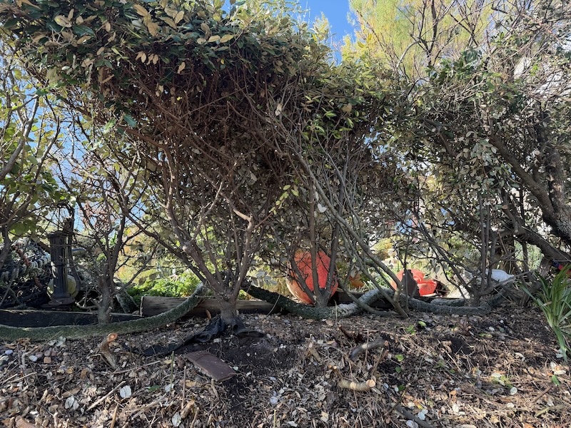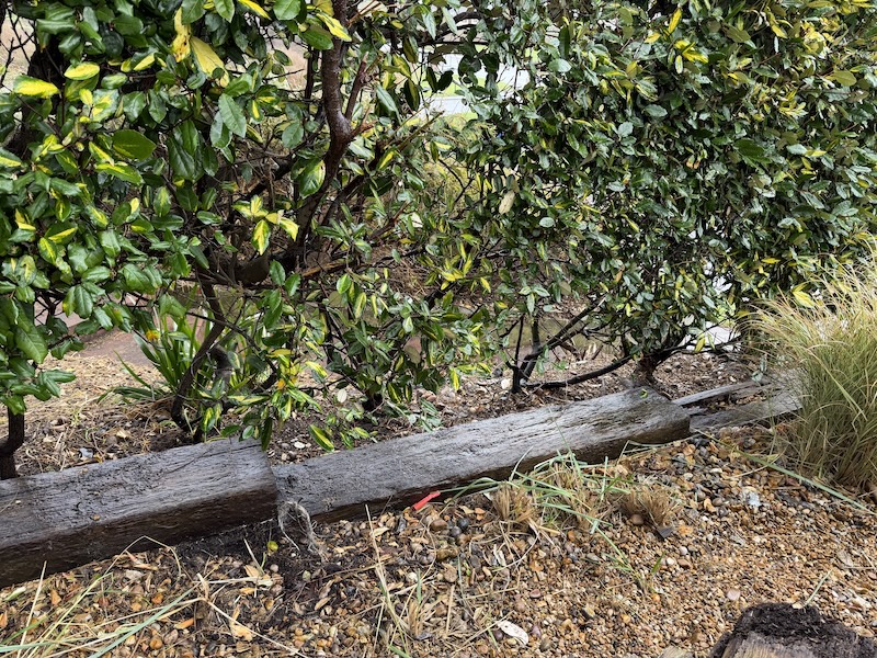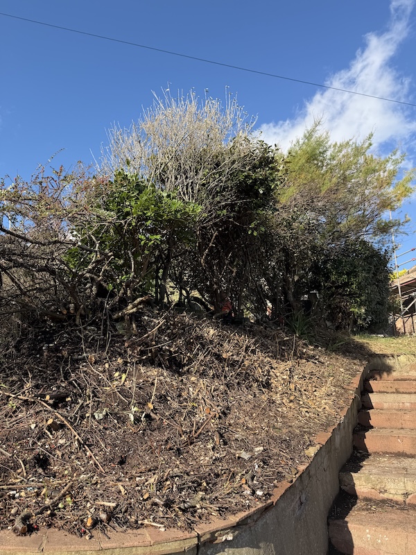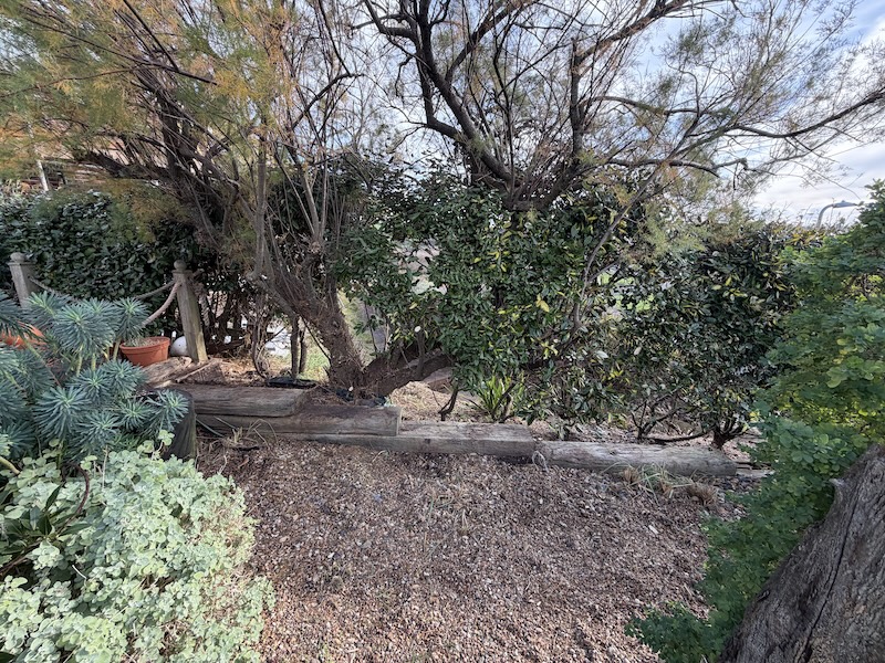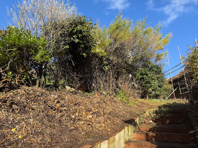 in cutting back his overgrown pathway at the left side of his property, leaving the side of my beach garden very exposed and see-through.