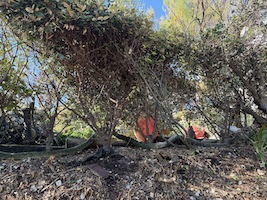 Both the large conifer and the olive tree were professionally trimmed by a local tree surgeon as they were both getting far too tall.