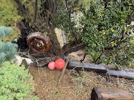 marine objects. On the left is how the front garden looked before work started and on the right after the lawn had been killed off and work had started.