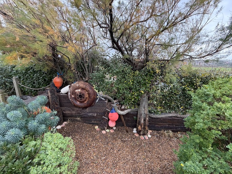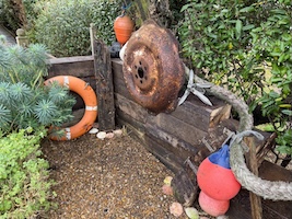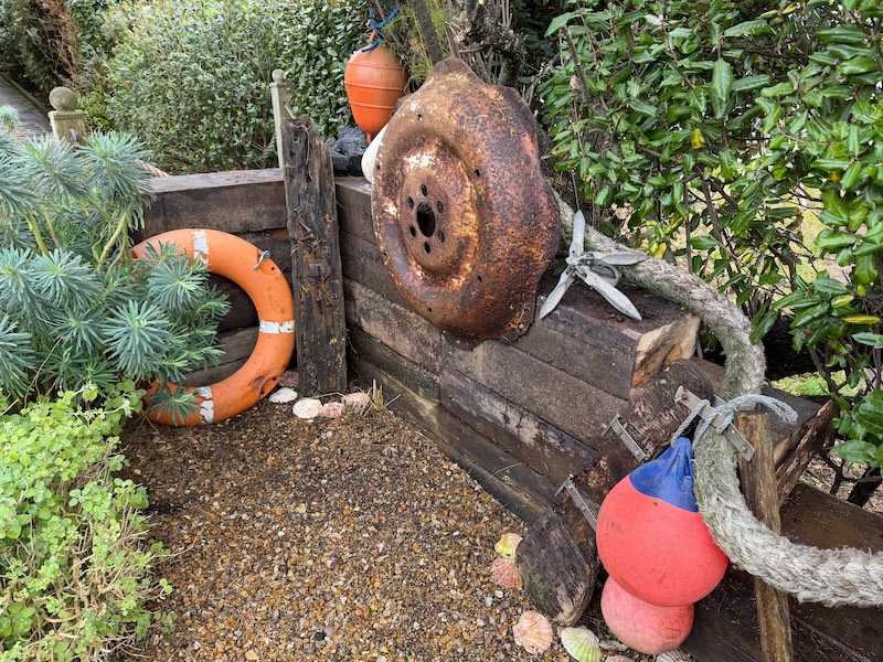 and seaside plants peep out from the many marine objects. Visitors can sit on the beach garden and enjoy their tea and cakes