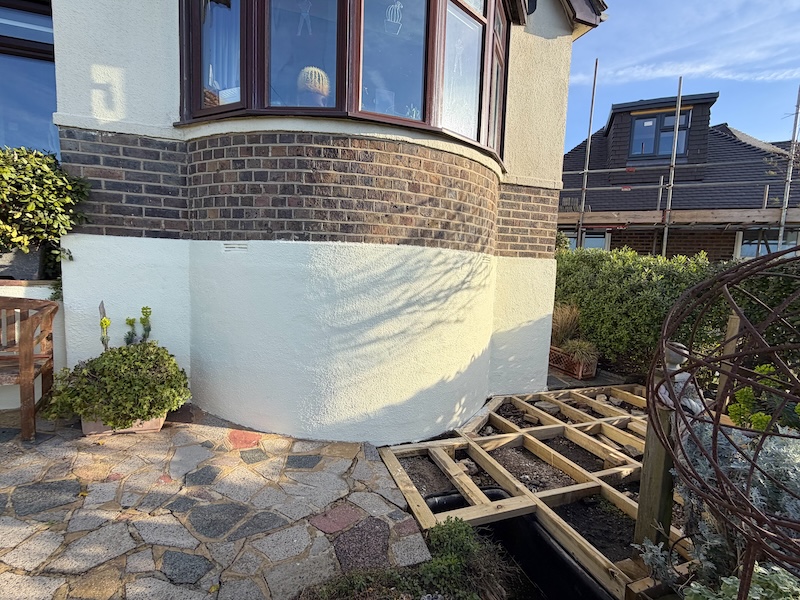 It was lifted and the frame work below had rotted and was removed and a new composite flooring laid with a new wooden frame below. The bay window wall base also had a new coat of paint too.