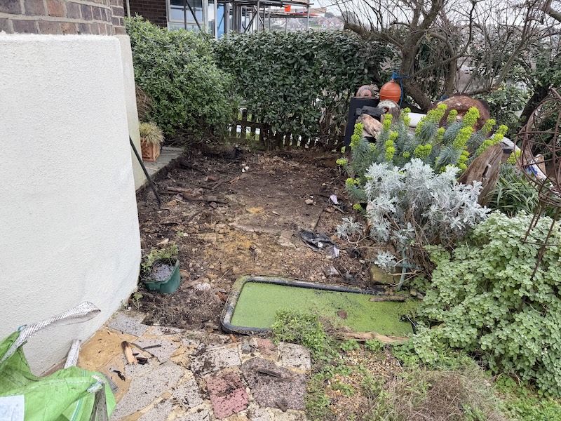 a small digger was brought in to achieve the desired new area. The three images below show the narrow patio after all containers removed. |